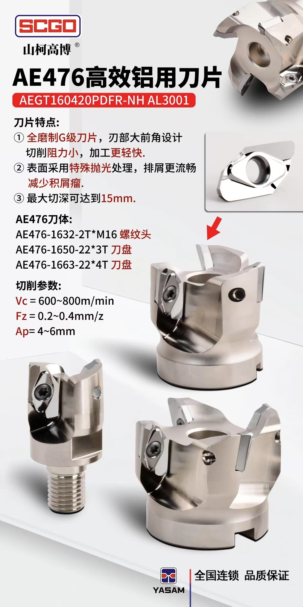 【概要描述】山柯高数控刀具有限公司_SE防尘刀柄,SE标准刀柄,SE高速刀柄,SE深腔刀柄,SE雕铣机刀柄,东莞市山柯高数控刀具有限公司是SE夹持系统的原创者,成立于2007年9月,拥有多项知识产品产权,秉承“振兴中国数控刀具行业,服务全球中小客户”的企业使命,专注于数控刀具的研发与销售,以全新创业理念和“耀欣模式”发展企业,为实现“让机器更高效”的企业愿景正不懈努力。AE476高效铝用刀片AEGT160420PDFR-NH AL3001刀片特点:①全磨制G级刀片,刃部大前角设计切削阻力小,加工更轻快。②表面采用特殊抛光处理,排屑更流畅减少积屑瘤.③ 最大切深可达到15mm.
