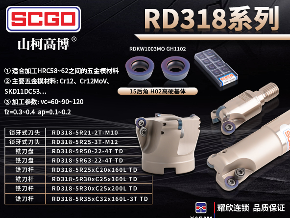 【概要描述】山柯高数控刀具有限公司_SE防尘刀柄,SE标准刀柄,SE高速刀柄,SE深腔刀柄,SE雕铣机刀柄,东莞市山柯高数控刀具有限公司是SE夹持系统的原创者,成立于2007年9月,拥有多项知识产品产权,秉承“振兴中国数控刀具行业,服务全球中小客户”的企业使命,专注于数控刀具的研发与销售,以全新创业理念和“耀欣模式”发展企业,为实现“让机器更高效”的企业愿景正不懈努力。RD318系列适合加工HRC58~62之间的五金模材料