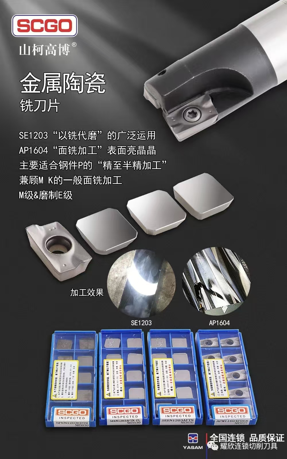 【概要描述】山柯高数控刀具有限公司_SE防尘刀柄,SE标准刀柄,SE高速刀柄,SE深腔刀柄,SE雕铣机刀柄,东莞市山柯高数控刀具有限公司是SE夹持系统的原创者,成立于2007年9月,拥有多项知识产品产权,秉承“振兴中国数控刀具行业,服务全球中小客户”的企业使命,专注于数控刀具的研发与销售,以全新创业理念和“耀欣模式”发展企业,为实现“让机器更高效”的企业愿景正不懈努力。金属陶瓷铣刀片,SE1203“以铣代磨”的广泛运用AP1604“面铣加工”表面亮晶晶主要适合钢件P的“精至半精加工”兼顾M K的一般面铣加工M级&磨制E级