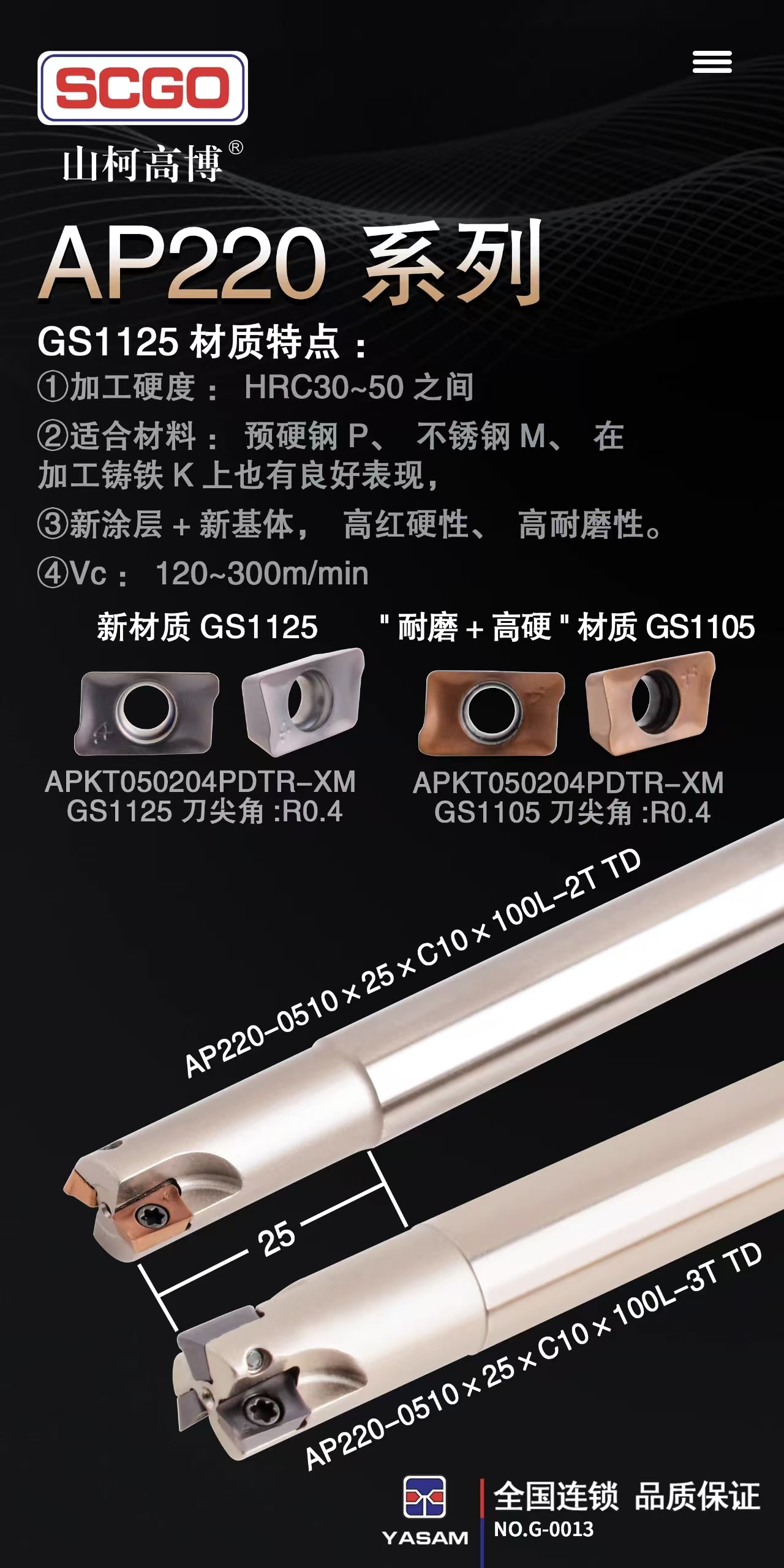 【概要描述】山柯高数控刀具有限公司_SE防尘刀柄,SE标准刀柄,SE高速刀柄,SE深腔刀柄,SE雕铣机刀柄,东莞市山柯高数控刀具有限公司是SE夹持系统的原创者,成立于2007年9月,拥有多项知识产品产权,秉承“振兴中国数控刀具行业,服务全球中小客户”的企业使命,专注于数控刀具的研发与销售,以全新创业理念和“耀欣模式”发展企业,为实现“让机器更高效”的企业愿景正不懈努力。AP220 系列 GS1125 材质特点:①加工硬度:HRC30~50 之间②适合材料 : 预硬钢 P、 不锈钢 M、 在加工铸铁 K上也有良好表现,③新涂层+新基体,高红硬性、高耐磨性。④Vc:120~300m/min