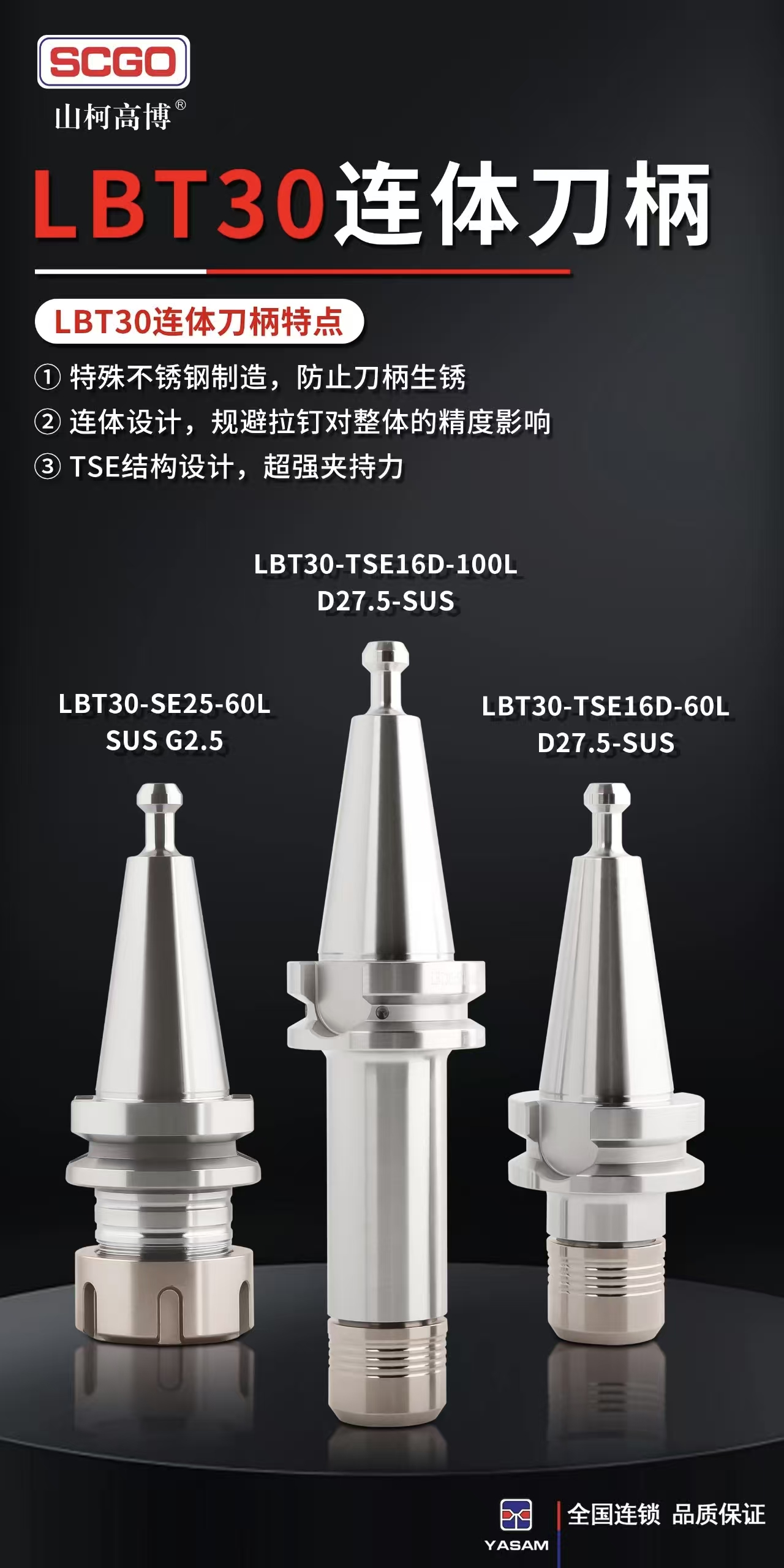 【概要描述】山柯高数控刀具有限公司_SE防尘刀柄,SE标准刀柄,SE高速刀柄,SE深腔刀柄,SE雕铣机刀柄,东莞市山柯高数控刀具有限公司是SE夹持系统的原创者,成立于2007年9月,拥有多项知识产品产权,秉承“振兴中国数控刀具行业,服务全球中小客户”的企业使命,专注于数控刀具的研发与销售,以全新创业理念和“耀欣模式”发展企业,为实现“让机器更高效”的企业愿景正不懈努力。LBT30连体刀柄特点①特殊不锈钢制造,防止刀柄生锈②连体设计,规避拉钉对整体的精度影响③TSE结构设计,超强夹持力